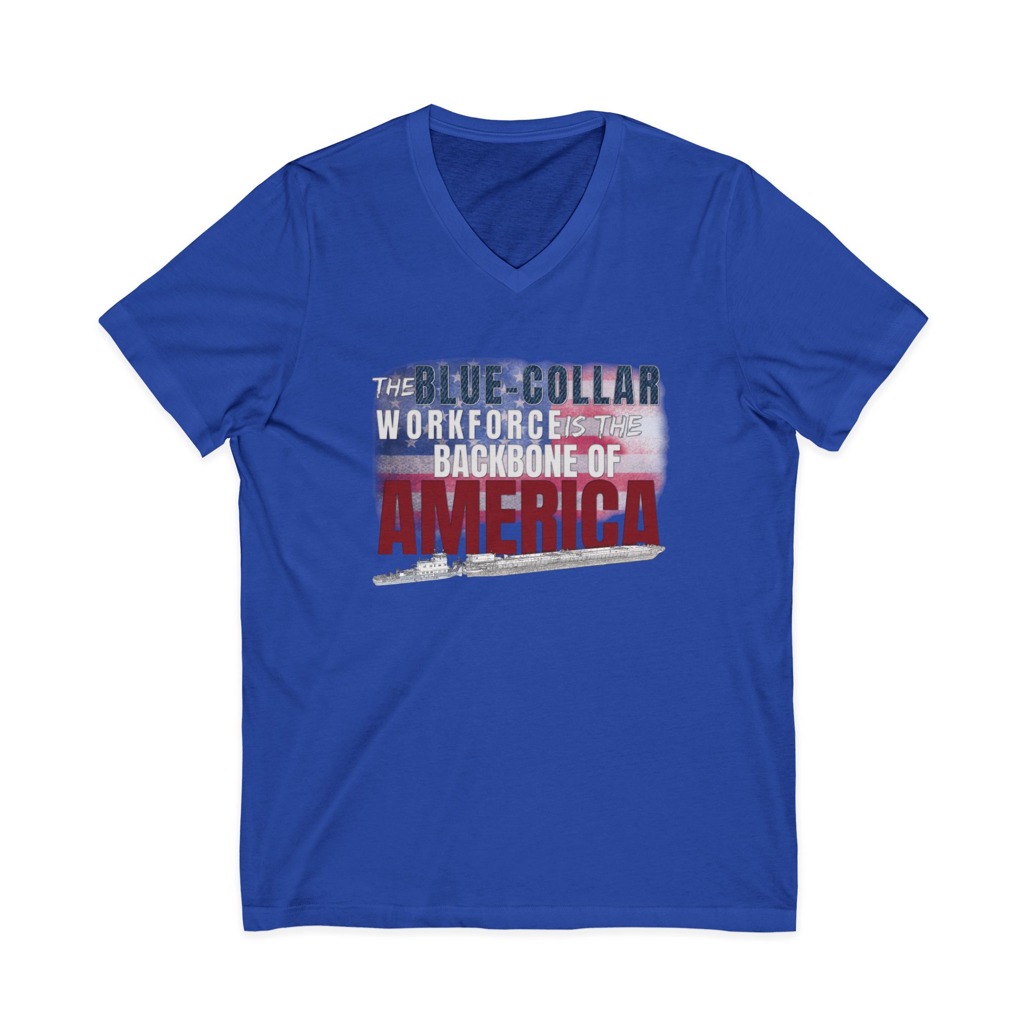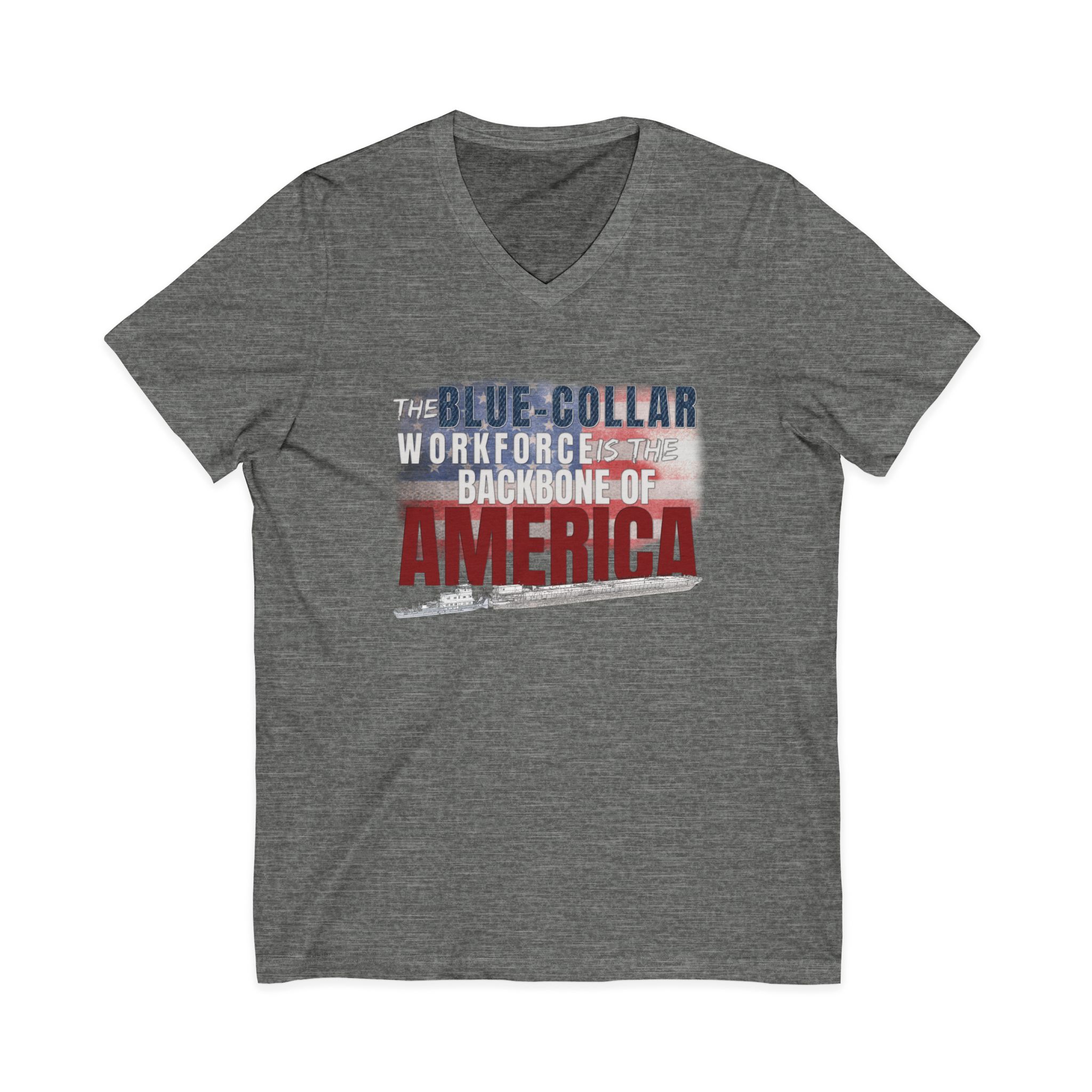 This soft, lightweight V-neck celebrates the grit and pride of America’s working hands. Washed fabric and a slightly worn flag motif give the shirt a lived-in, honest look—like something you reach for on early mornings and late shifts. The bold text—calling out the blue-collar workforce as America’s backbone—sits above a barge, letting the message speak without shouting. Comfortable enough for long days on site, yet neat enough to wear out for a quick errand or backyard cookout, this tee fits into routines where work and pride meet.