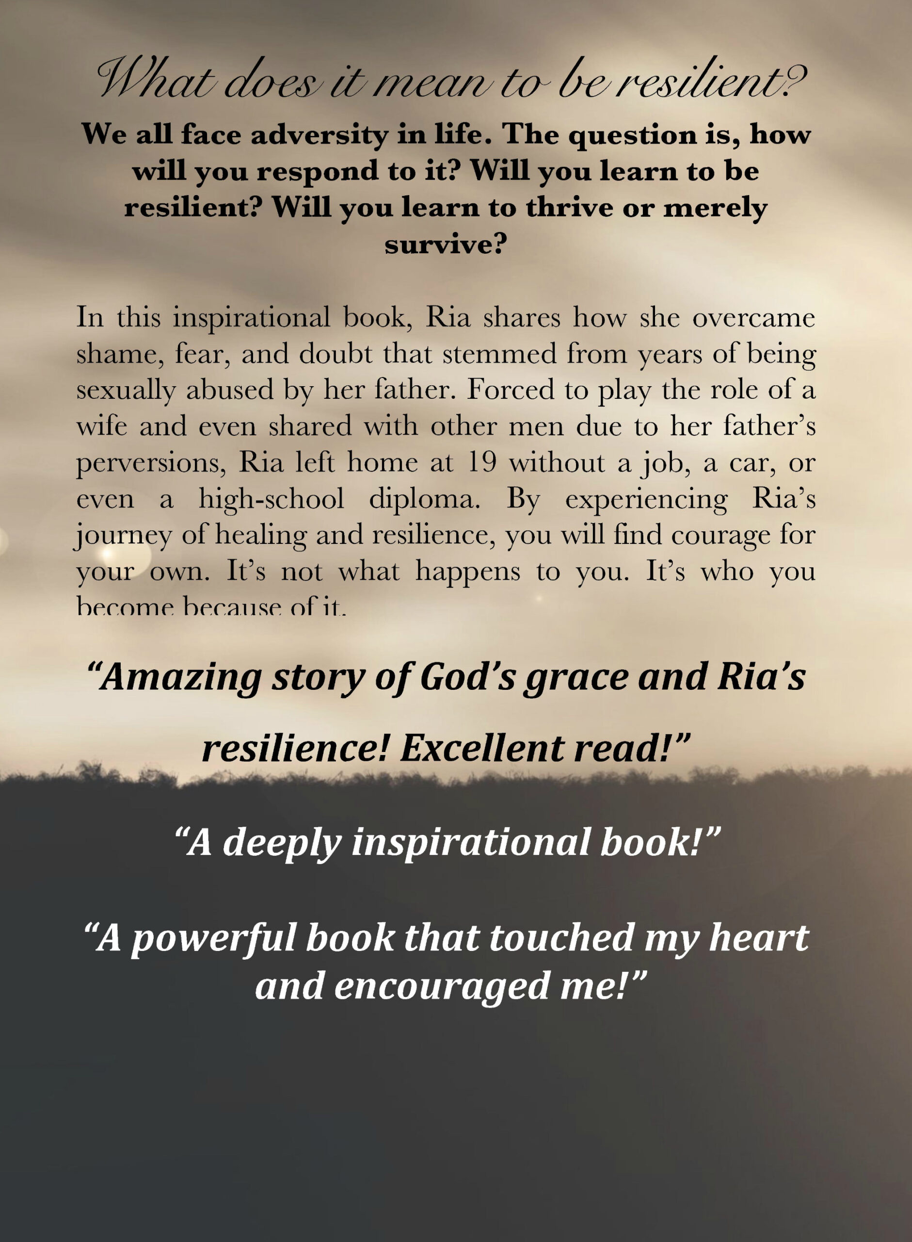 By experiencing Ria’s journey to resilience, you will find courage for your own. What happens to us in life isn’t as important as how we respond to it. The choices we make today will define us tomorrow.