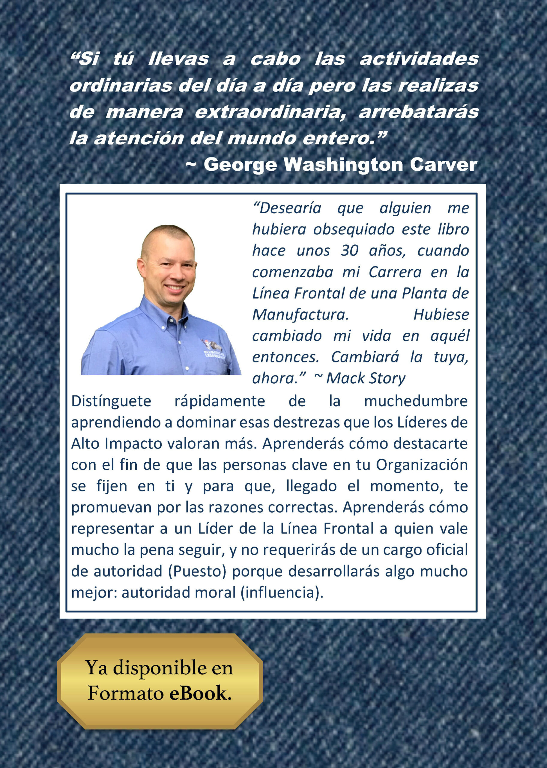“Desearía que alguien me hubiera obsequiado este libro hace unos 30 años, cuando comenzaba mi Carrera en la Línea Frontal de una Planta de Manufactura. Hubiese cambiado mi vida en aquél entonces. Cambiará la tuya, ahora.” ~ Mack Story Distínguete rápidamente de la muchedumbre aprendiendo a dominar esas destrezas que los Líderes de Alto Impacto valoran más. Aprenderás cómo destacarte con el fin de que las personas clave en tu Organización se fijen en ti y para que, llegado el momento, te promuevan por las razones correctas. Aprenderás cómo representar a un Líder de la Línea Frontal a quien vale mucho la pena seguir, y no requerirás de un cargo oficial de autoridad (Puesto) porque desarrollarás algo mucho mejor: autoridad moral (influencia).