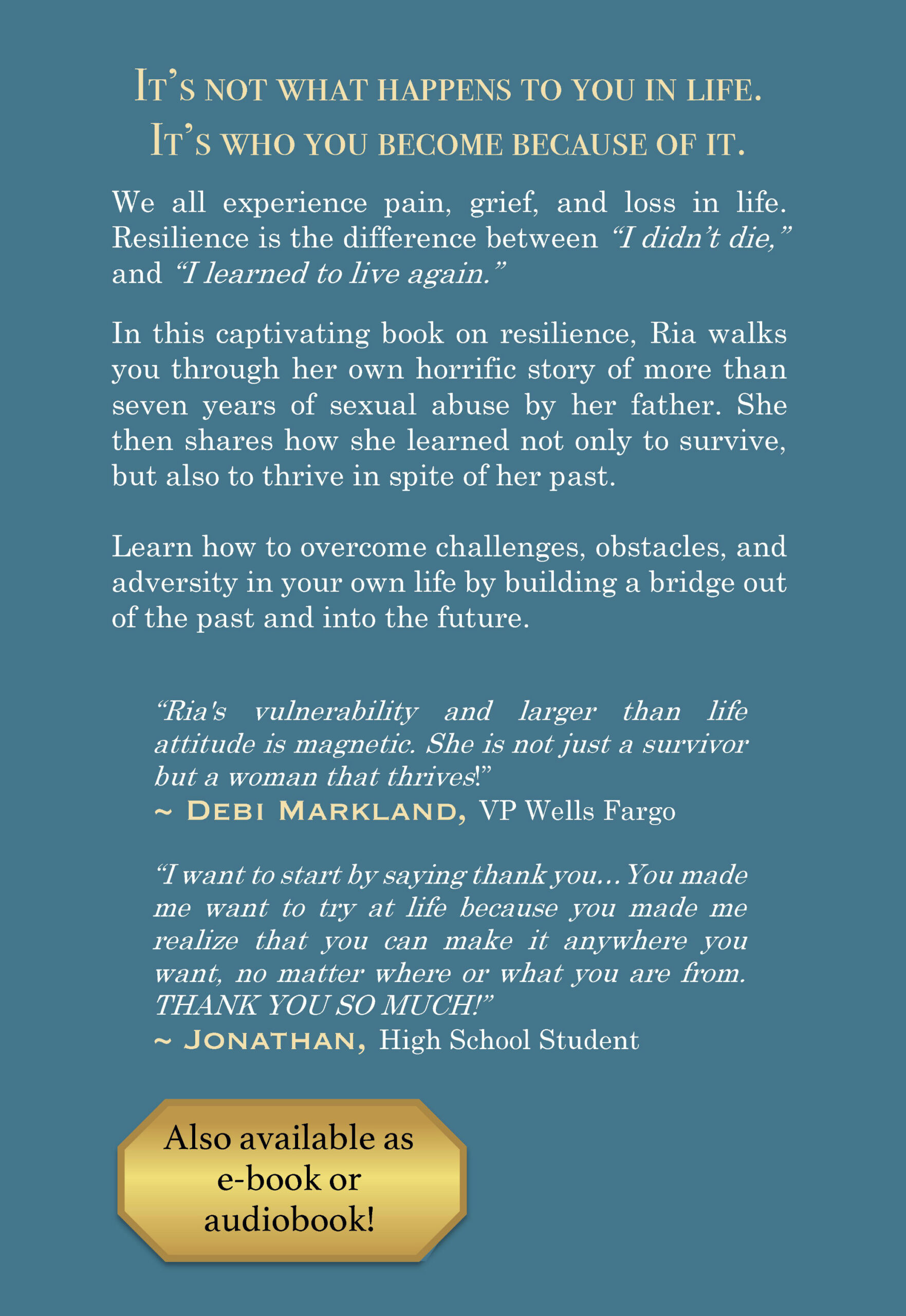 In this captivating book on resilience, Ria walks you through her own horrific story of more than seven years of sexual abuse by her father. She then shares how she learned not only to survive, but also to thrive in spite of her past. Learn how to overcome challenges, obstacles, and adversity in your own life by building a bridge out of the past and into the future. Key chapters include: