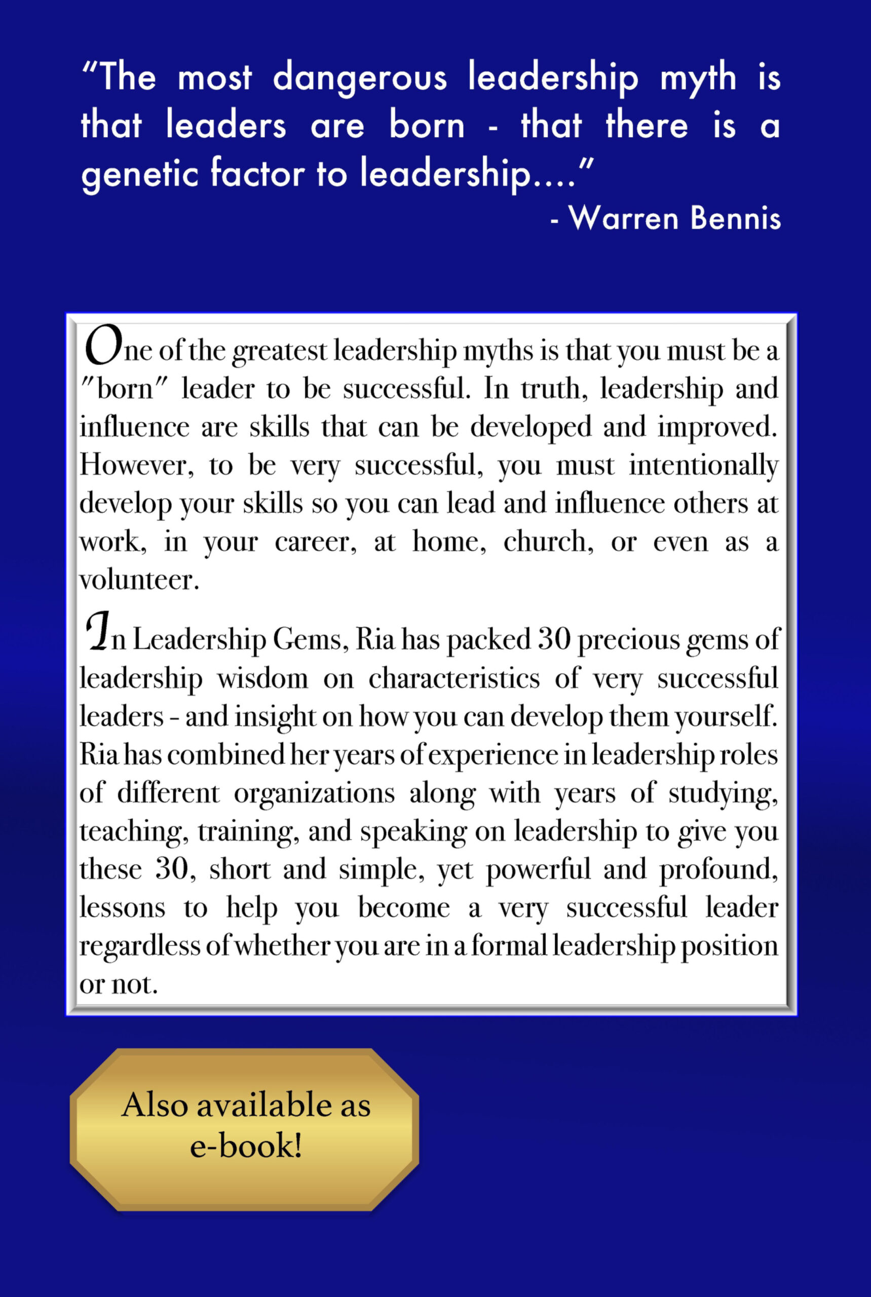 In Leadership Gems, Ria has packed 30 precious gems of leadership wisdom on characteristics of very successful leaders – and insight on how you can develop them yourself. Ria has combined her years of experience in leadership roles of different organizations along with years of studying, teaching, training, and speaking on leadership to give you these 30, short and simple, yet powerful and profound, lessons to help you become a very successful leader regardless of whether you are in a formal leadership position or not.