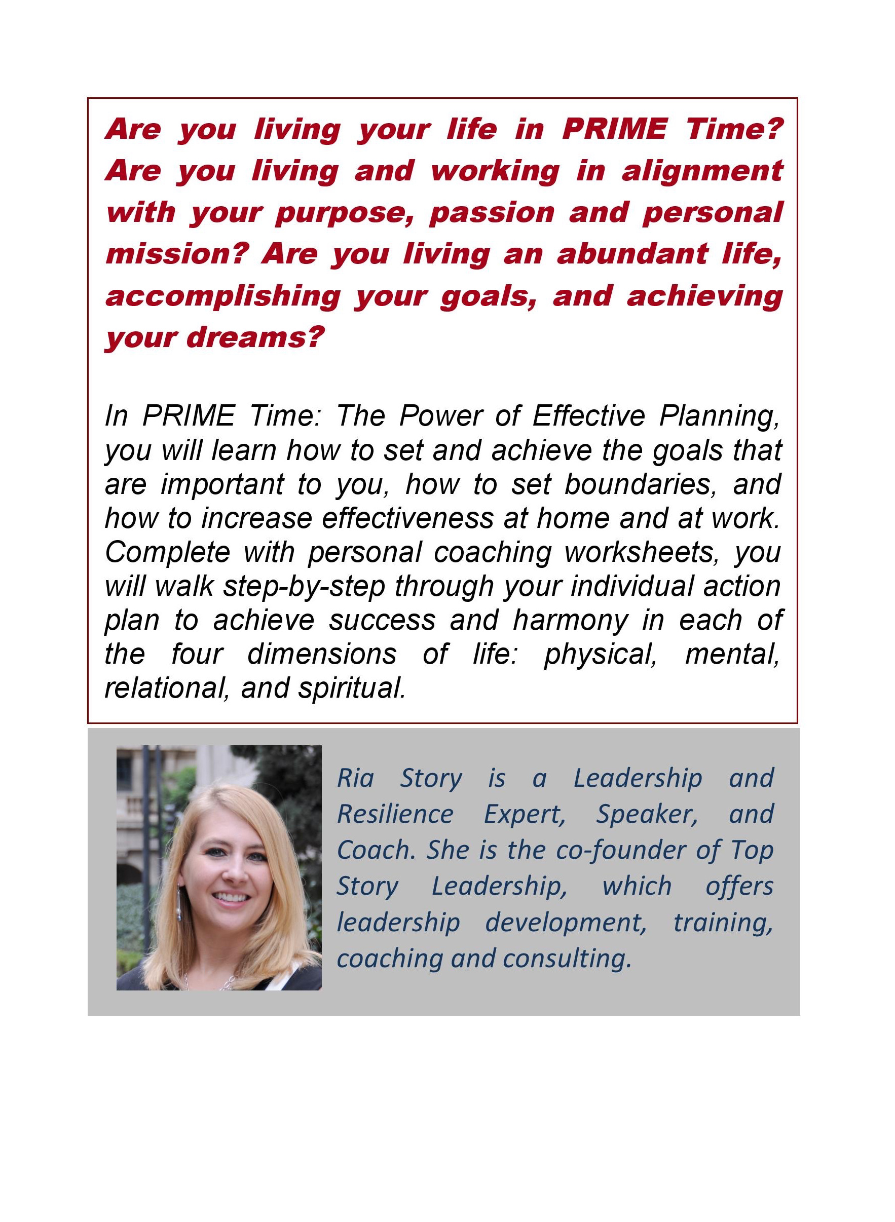 In PRIME Time: The Power of Effective Planning, you will learn how to set and achieve the goals that are important to you, how to set boundaries, and how to increase effectiveness at home and at work. Complete with personal coaching worksheets, you will walk step-by-step through your individual action plan to achieve success and harmony in each of the four dimensions of life: physical, mental, relational, and spiritual.